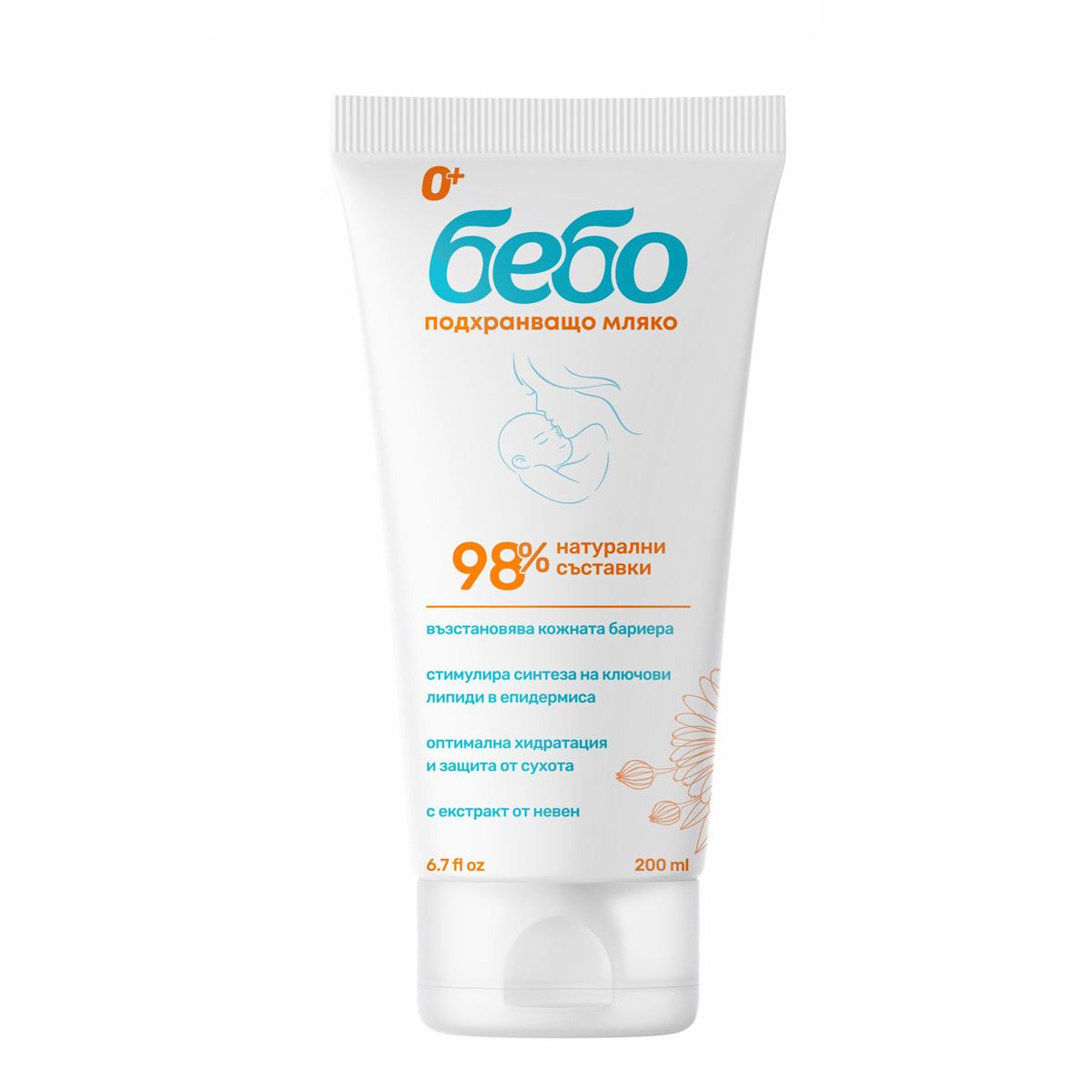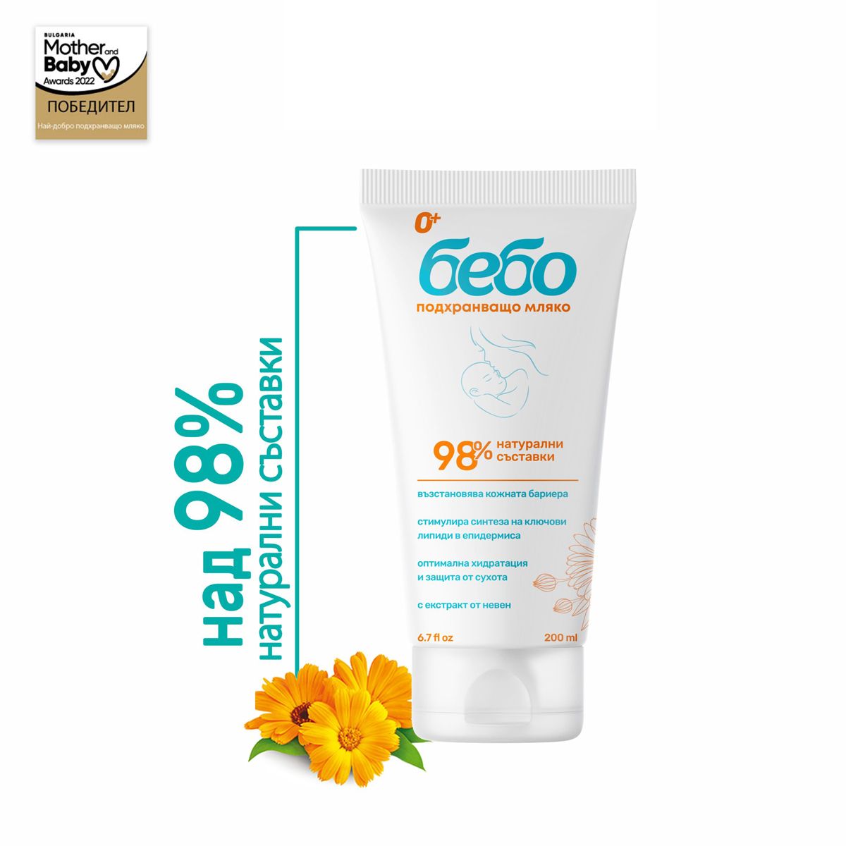 - Подхранващото мляко за тяло бебо с над 98% натурални съставки осигурява незабавна хидратация и дълготрайна защита от напукване и сухота.