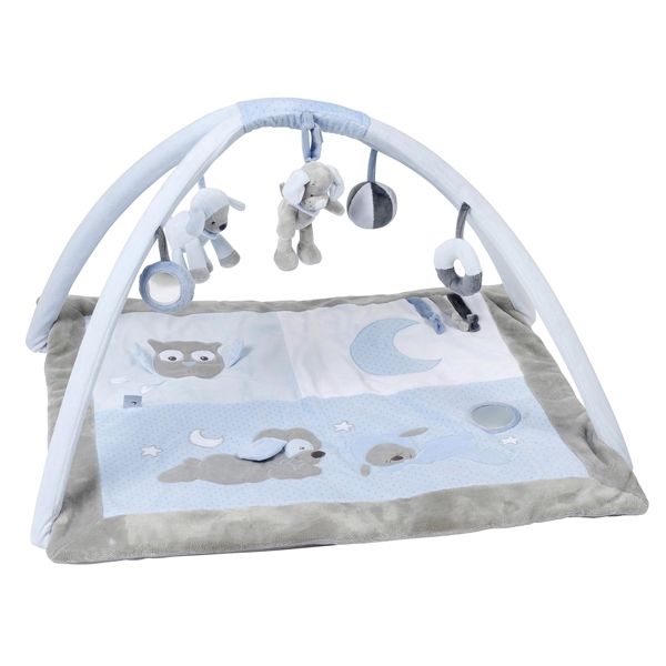 - Синьо килимче за игра с две арки за закачване на играчки.