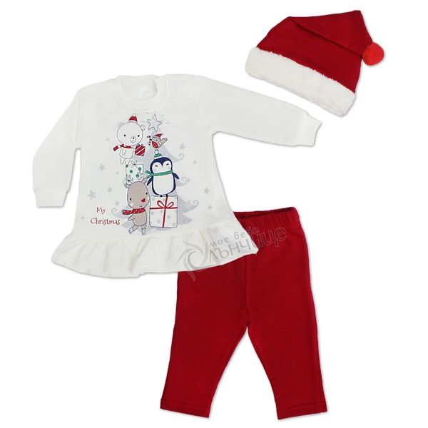 - Комплекта включва блузка с дълъг ръкав, панталон с ластик и коледна шапка с пухчета.