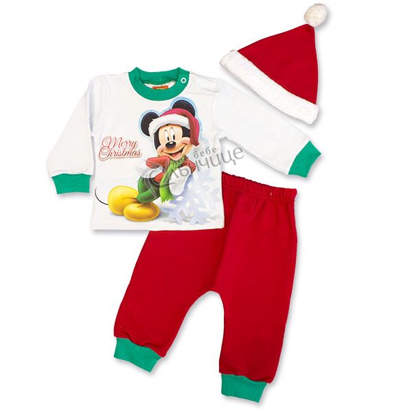 - Комплекта включва блузка с дълъг ръкав, панталон с ластик и коледна шапка.