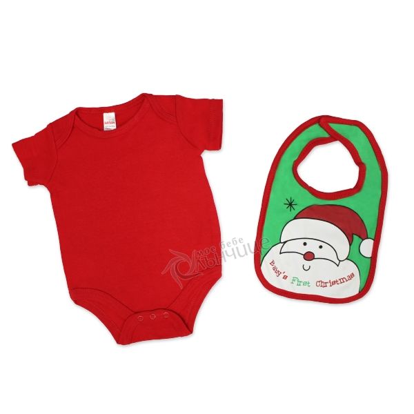 - Комплектът се състои от три части - гащеризон с дълъг ръкав, боди с къс ръкав и лигавник.