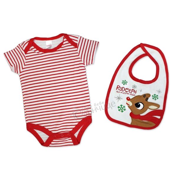 - Комплектът се състои от три части - гащеризон с дълъг ръкав, боди с къс ръкав и лигавник.