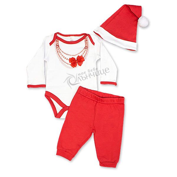 - Комплектът включва боди с дълъг ръкав, панталон и весела коледна шапка