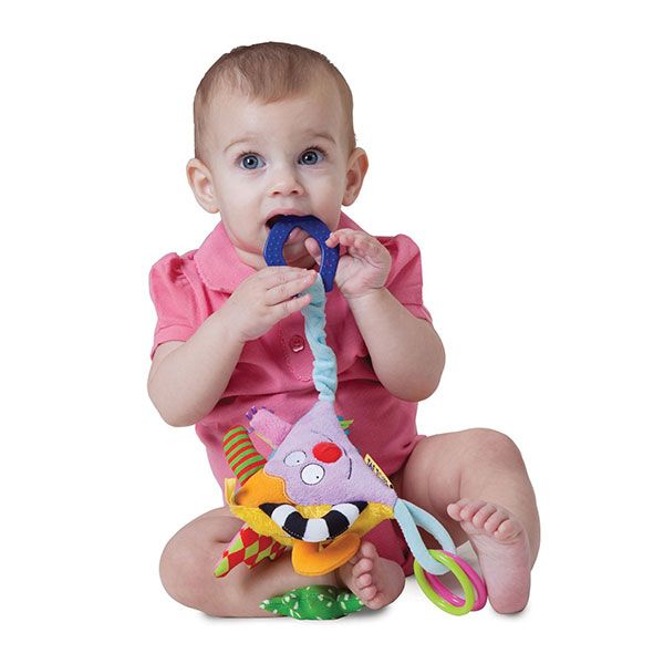 - Многофункционалната играчка включва пластмасови халки, нечупливо огледало, чесалка и шумяща плюшена пирамида, издаваща камбанен звън.