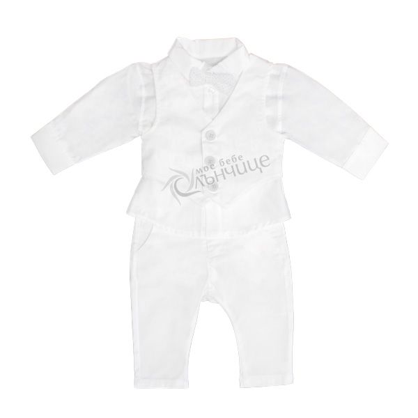 - Комплектът включва елек, риза с дълъг ръкав, папийонка и панталон.