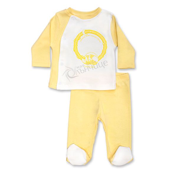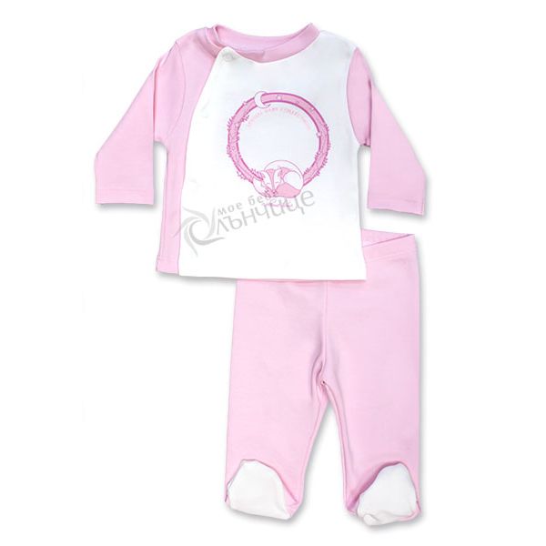- Комплекта предлага жилетка тип „прегърни ме" с копчета тик-так в предната част, за да осигури удобно преобличане. Ританката е снабдена с ластик в горната част.