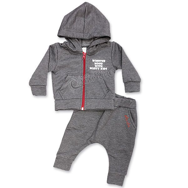 - Суичъра е снабден с качулка и джобчета в предната част. Панталона е тип потур и също с джобчета в предната си част.