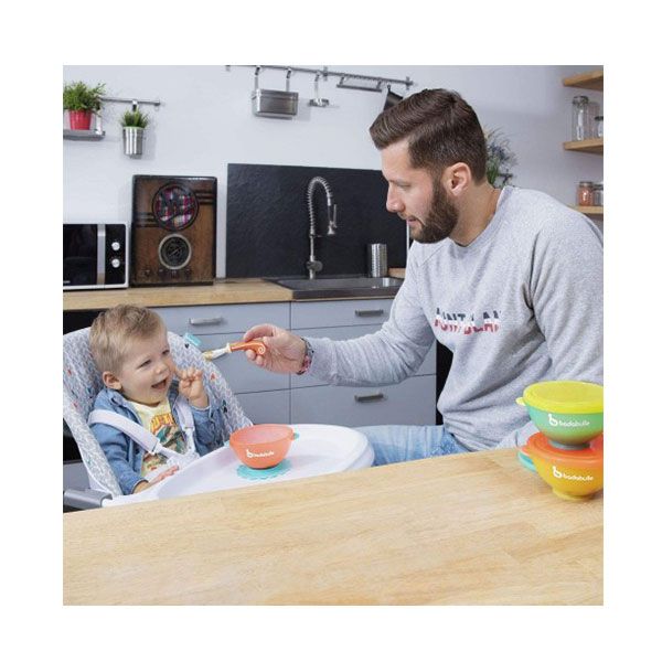 - Комплект от 3 броя цветни купички с вместимост 300 ml, подходящи за бебешки храни, пюрета и закуски.