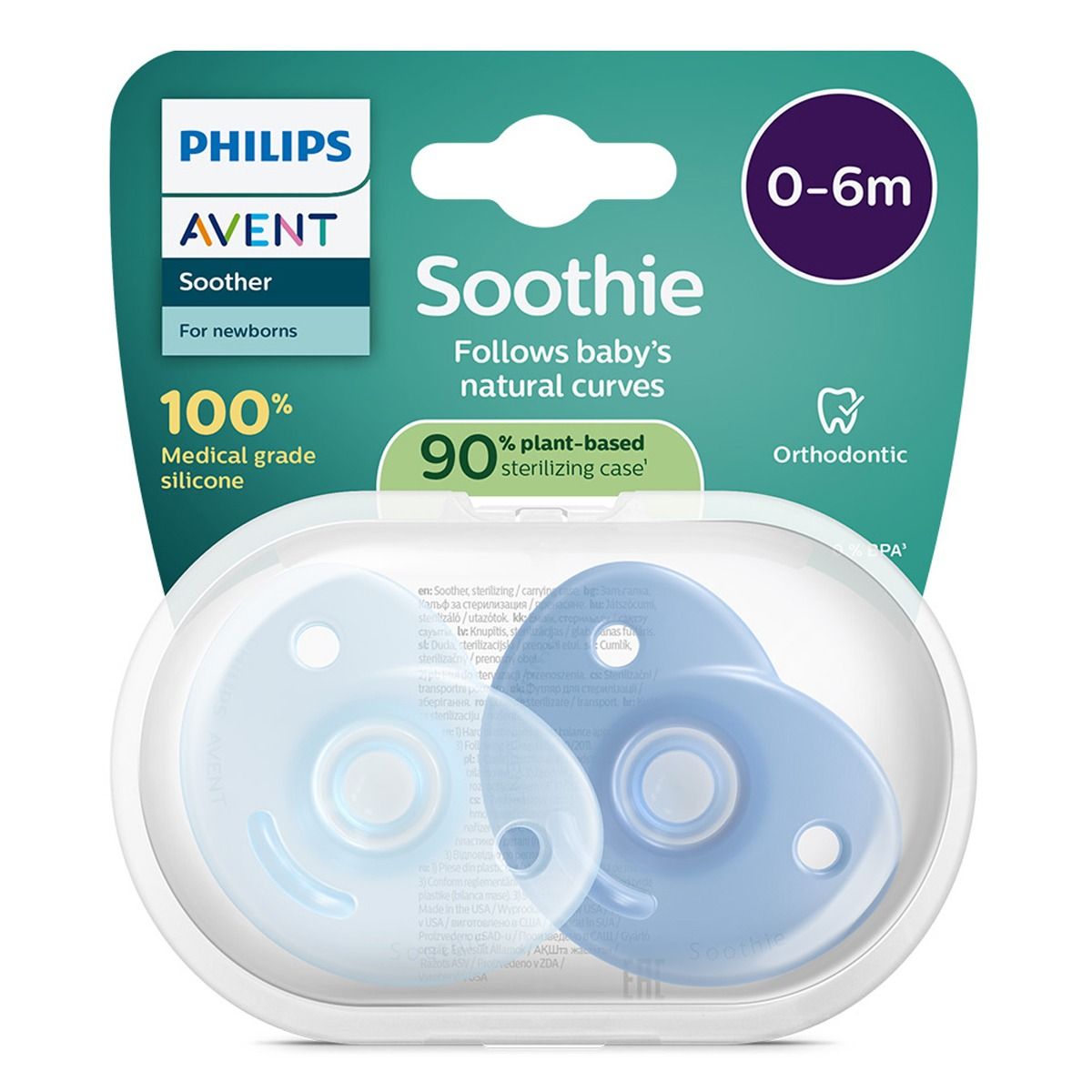 - Комплектът съдържа 2 бр. залъгалки Philips Avent Soothie и 1 бр. кутия за стерилизация и съхранение.