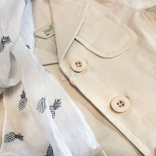 - Комплекта се предлага в цвят бежов, а стилното шалче е изработено в бял цвят.