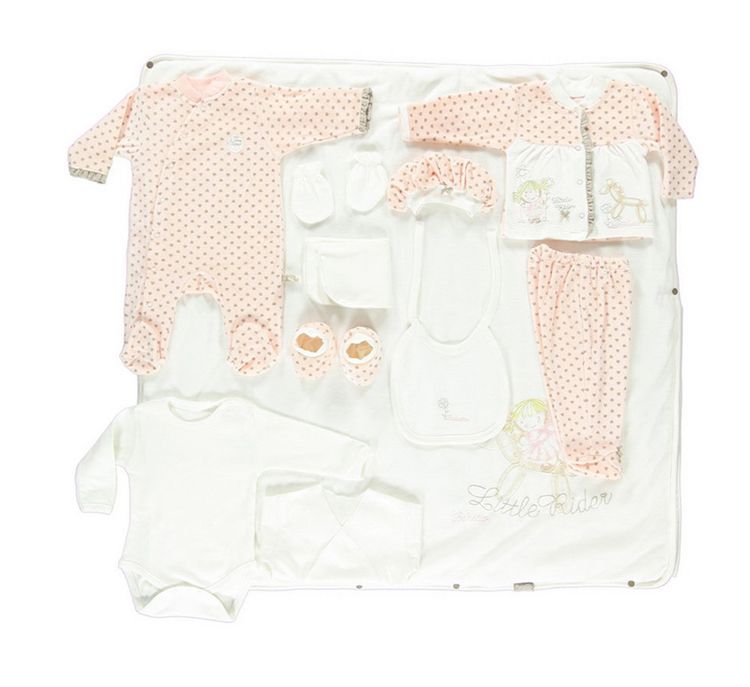 Комплект за изписване от 12 части идва с всичко необходимо за щастливия момент. Изработен от най-качествени материали съобразени с нежната и чувствителна бебешка кожа. Предлага се в изключително красиви нюанси на бяло и розово, в допълнение от симпатични къдрички.