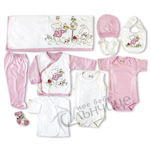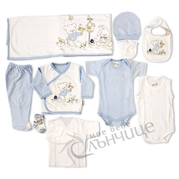 Изключително сладък комплект за изписване на новородено. Включва десет части с всичко необходимо за щастливия момент. Изработен от 100% памучна тъкан за деликатната и фина кожа на бебето.