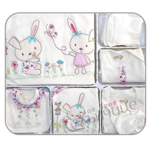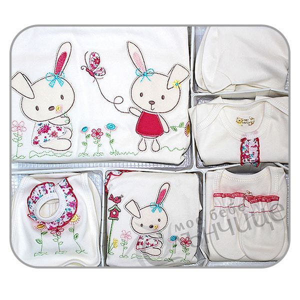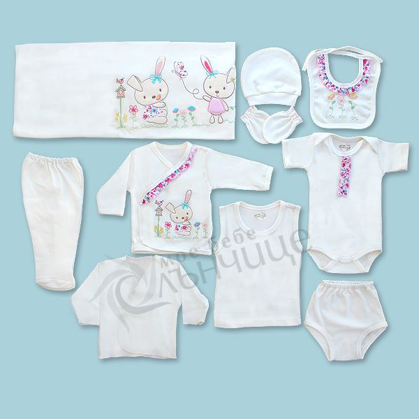 Комплект за изписване на новородено бебе има 10 части и е изработен от 100% памук. Предлага се в бял цвят с комбинация от розов или светло розов нюанс. Изключително очарователна картинка с допълнение от прелестни къдрички.