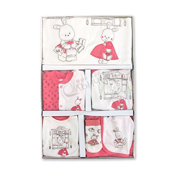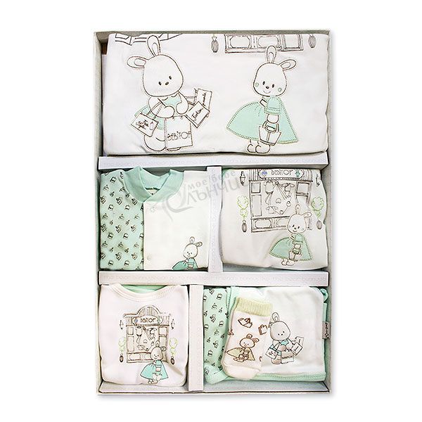 - Kомплект за изписване на новородено, изработен от 100% памучна тъкан.