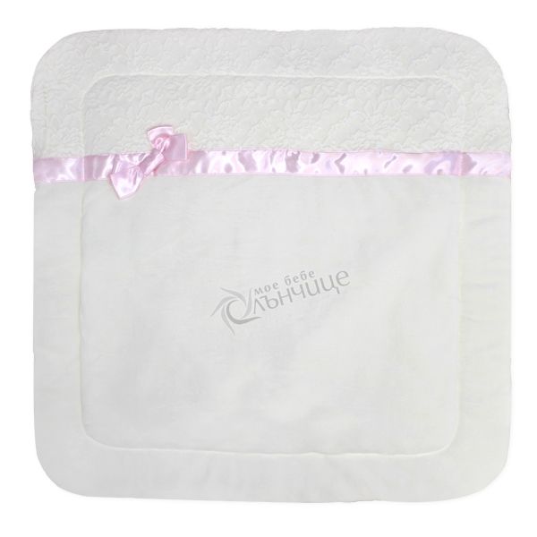 - Бебешкото одеяло е изработено с топъл пълнеж от специална силиконова вата с кухи влакна за по-добра термоизолация и мек плюш. Украсено с изящна дантела и розова панделка в горната си част.