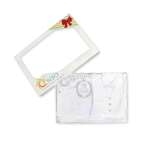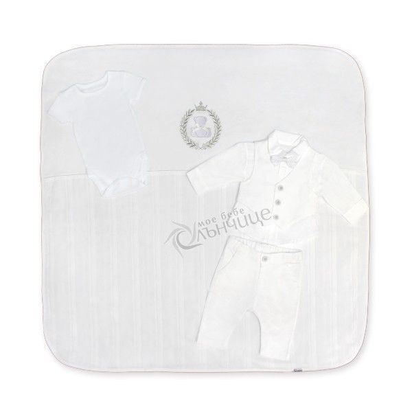 - Комплектът се състои от официално костюмче, боди с къс ръкав, чорапки и пелена с красива бродерия.