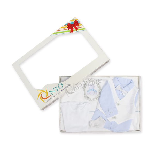 - Комплектът се състои от официално костюмче, боди с къс ръкав, чорапки и пелена с красива бродерия.