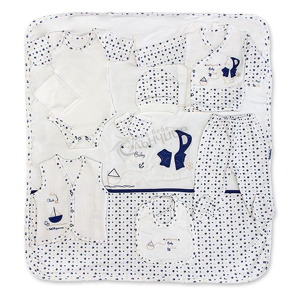 - Изключително пълен комплект за изписване на новородено изработен от 100% памук.