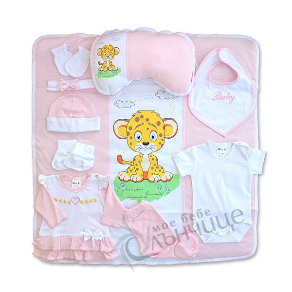 Комплект за изписване на новородено изработен с грижа и внимание от 100% висококачествен памук, подходящ за нежната и фина кожа на новородено. Симпатичния дизайн се допълва от нежен розов нюанс и малко любопитно тигърче.