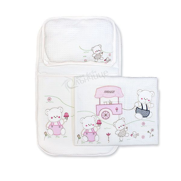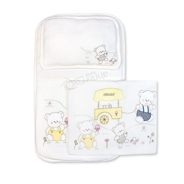 - Комплект за количка от три части изработен от висококачествени материали, за да е добре защитено бебето при разходка с количка.