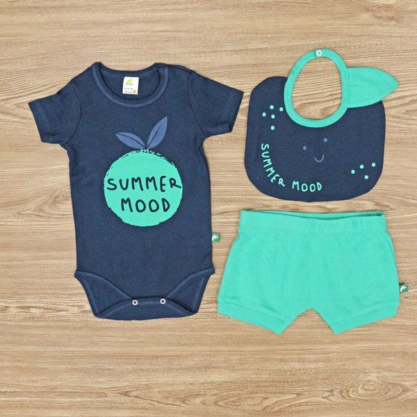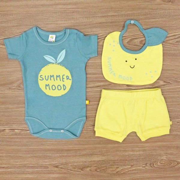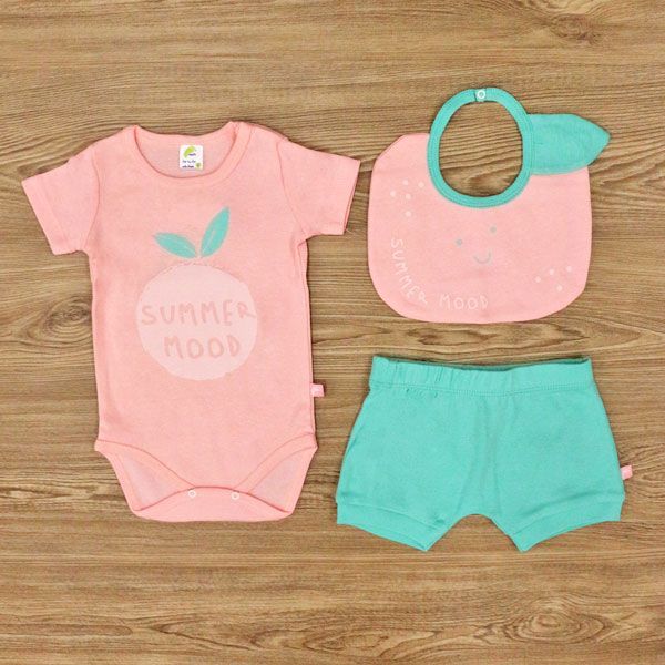 - Мек и удобен летен комплект от 3 части, подходящ за летния сезон, състоящ се от боди с къс ръкав, къси панталонки и закачлив лигавник.