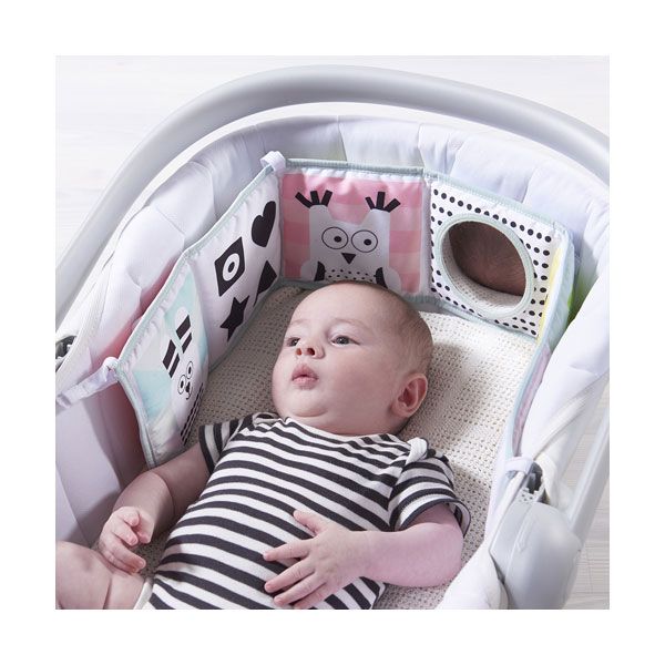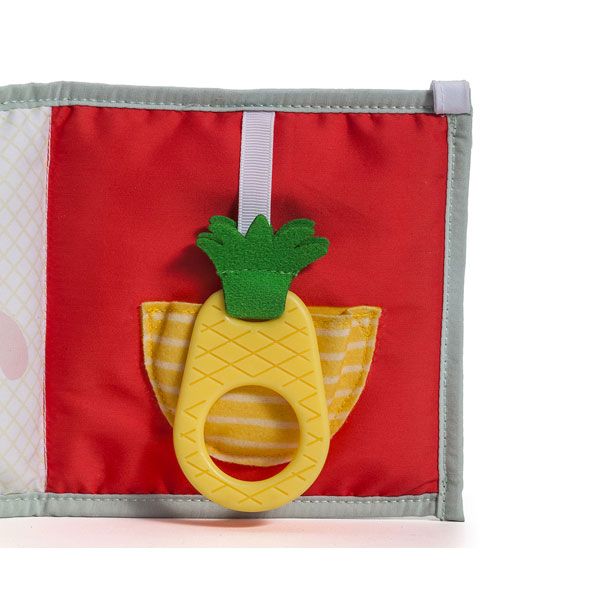 - Втората страна (3м+) е създадена с богати цветове, текстури и шимолящи елементи. 3D дейности включително чесалка за зъбките и джобче. Развива фината моторика на бебето.