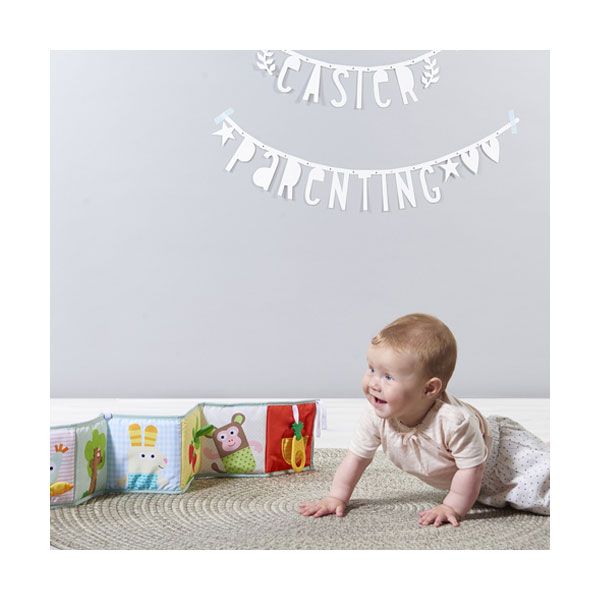 - Книгата стои сама изправена и насърчава усилията на бебето да лази и да се движи.