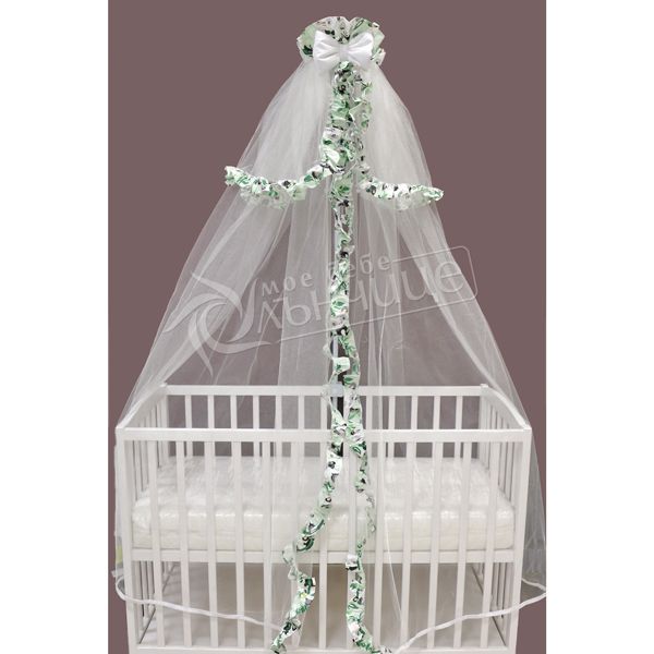 - Балдахин за детското легло изработен от нежен тюл и декориран с цветни панделки и елементи.