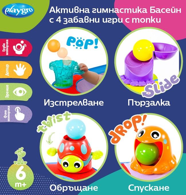 Активната гимнастика PLAYGRO Басейн с 30 топки предлага на бебето свят, изпълнен с движение, откривателство и радост. Басейнът осигурява многостранна игра, която подкрепя физическото, сетивното и когнитивното развитие на детето от най-ранна възраст.