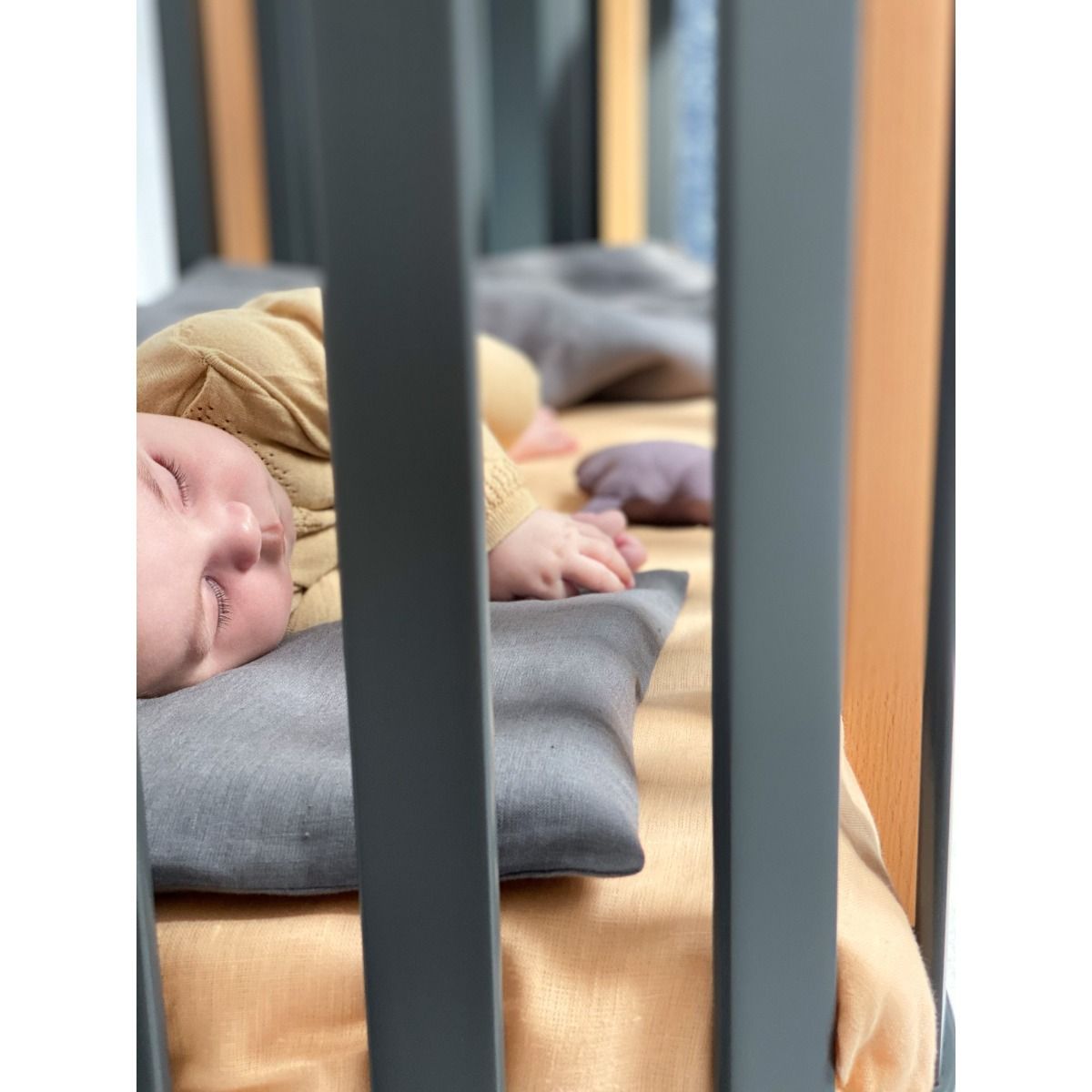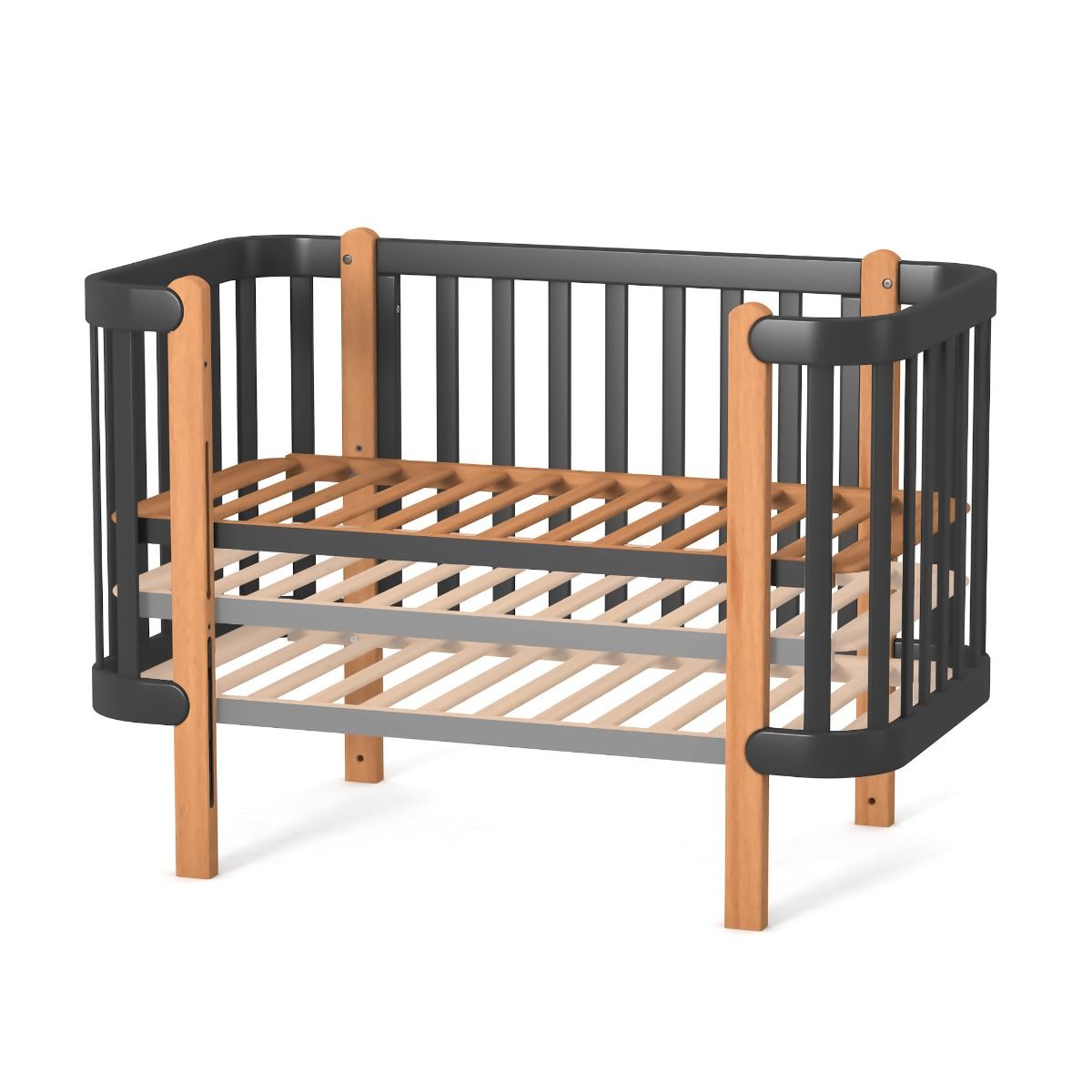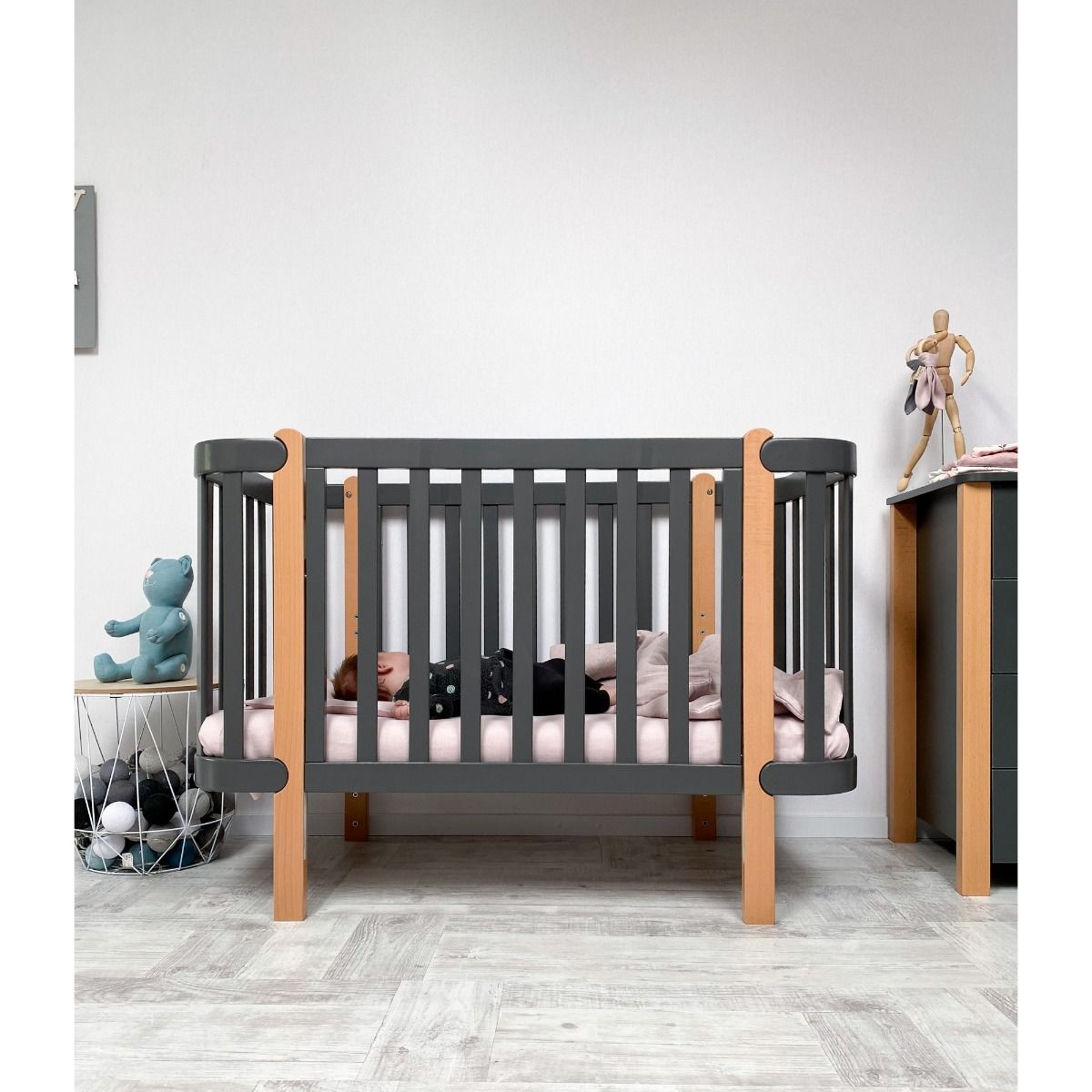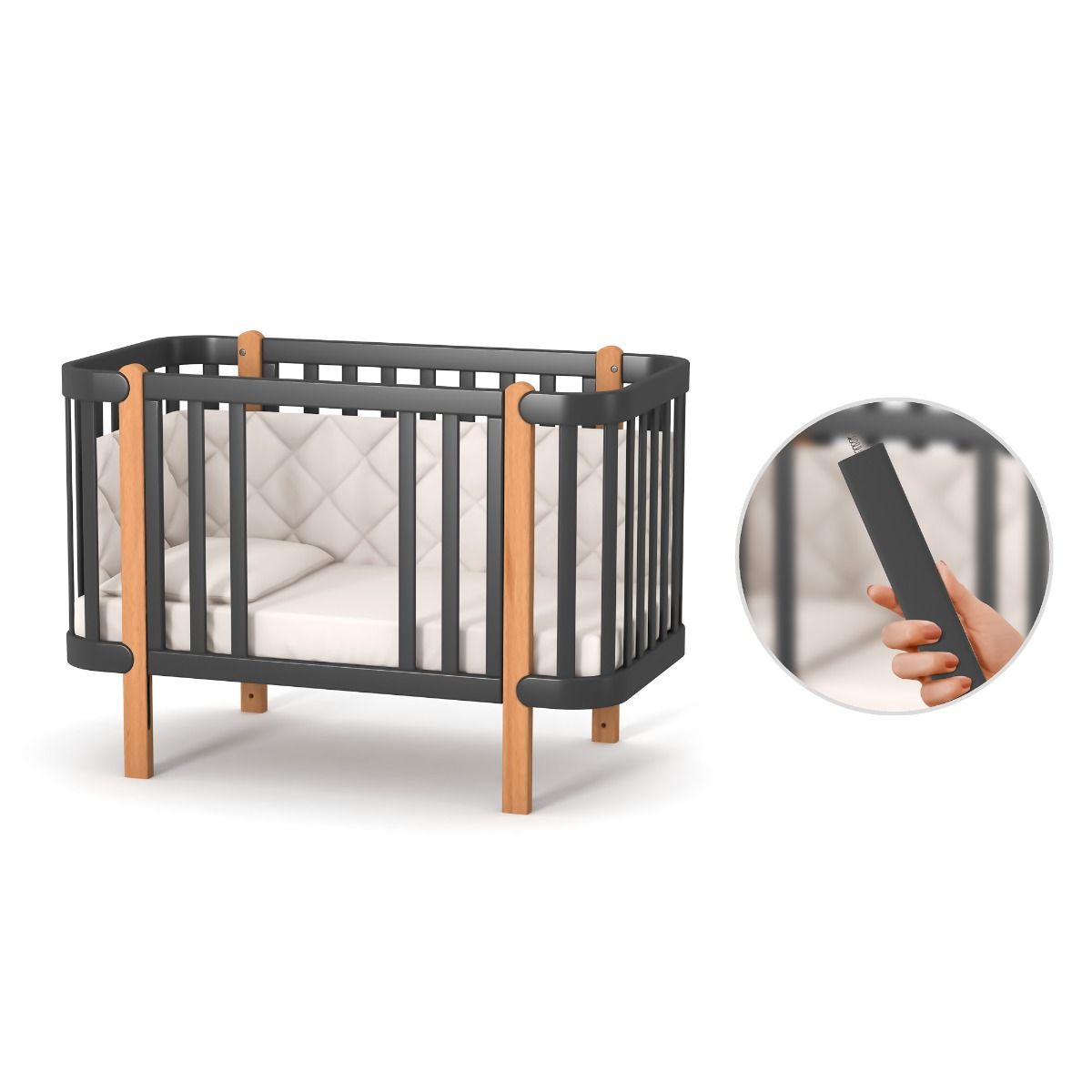 - Падаща решетка: Едната дълга страна е с падащ механизъм, който осигурява лесен достъп до бебето, особено при нощни грижи. Допълнително, в предната решетка са предвидени 3 сваляеми ламела, които позволяват на поотрасналото дете да излиза и влиза самостоятелно от леглото.