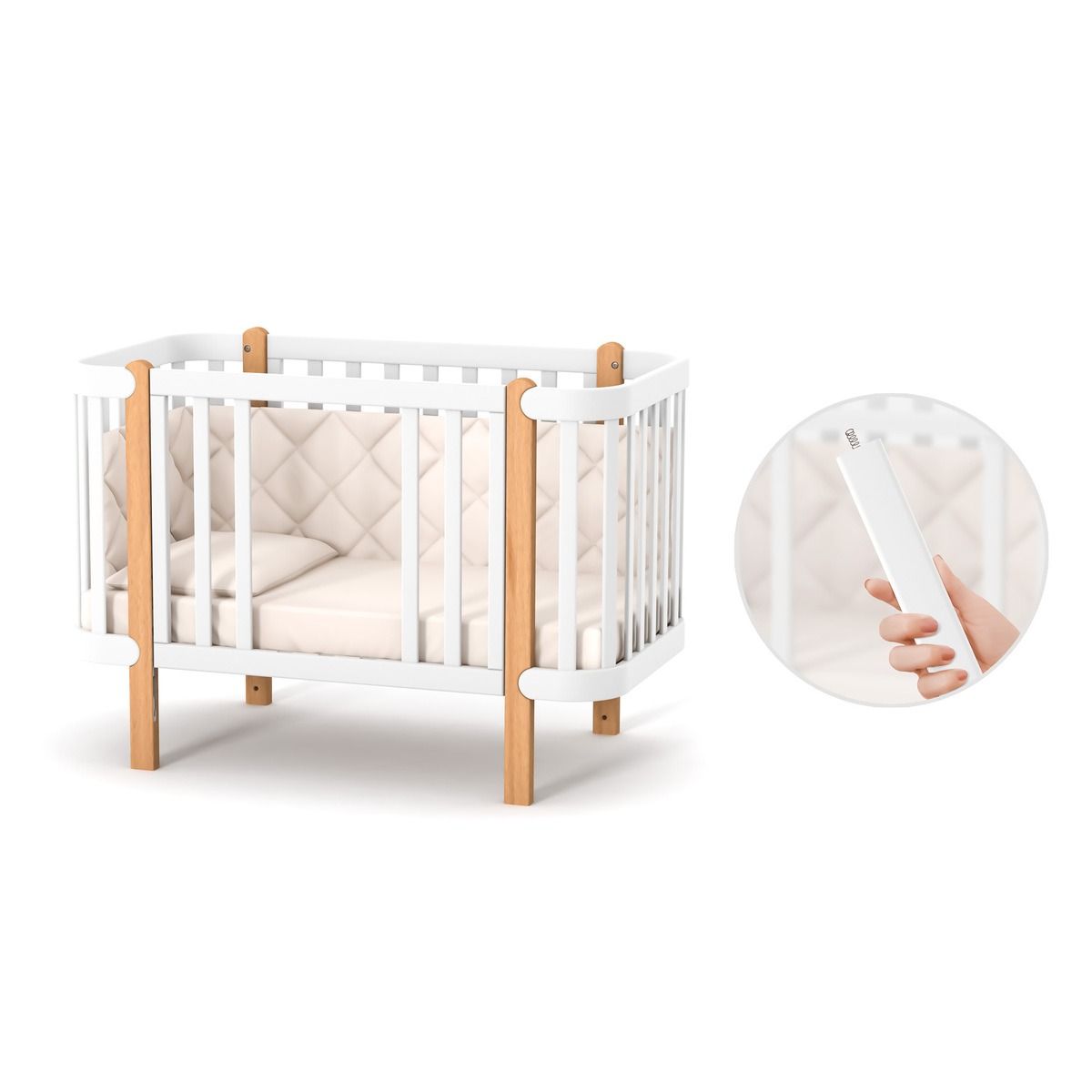 - Падаща решетка: Едната дълга страна е с падащ механизъм, който осигурява лесен достъп до бебето, особено при нощни грижи. Допълнително, в предната решетка са предвидени 3 сваляеми ламела, които позволяват на поотрасналото дете да излиза и влиза самостоятелно от леглото.
