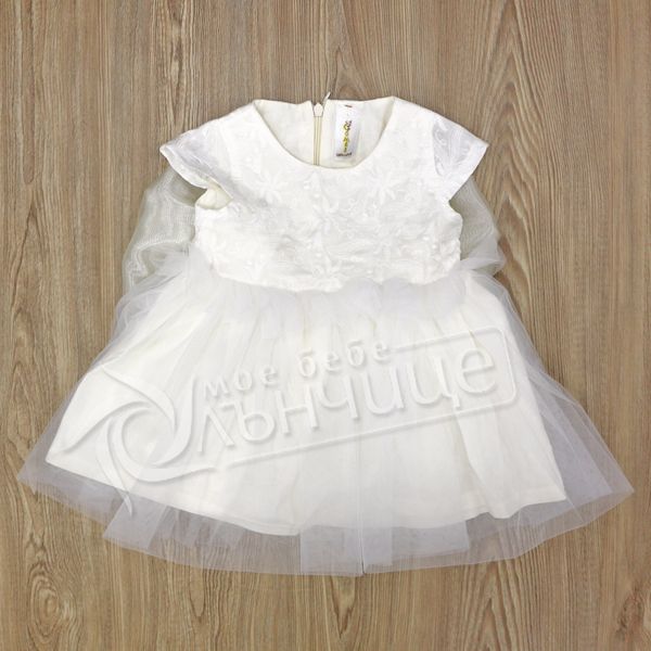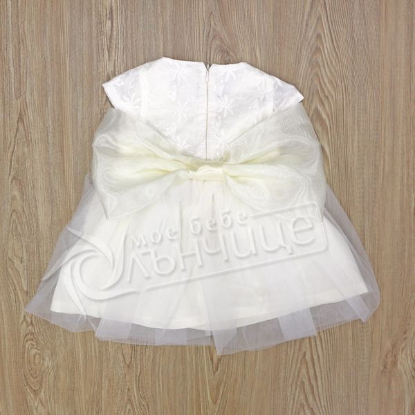 - Детска рокля с тюл в екрю с къс ръкав и ефектна голяма панделка.