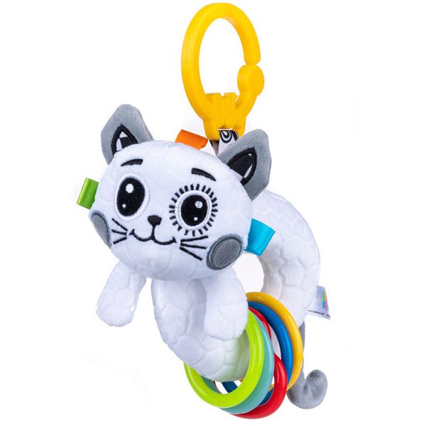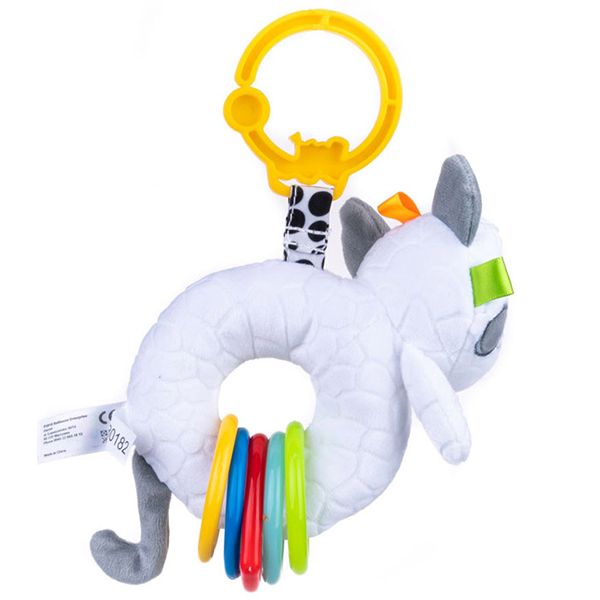 - Главата му е украсена с етикети с различна текстура, а коремът му е украсен с цветни кръгове, които весело дрънчат при разклащане.