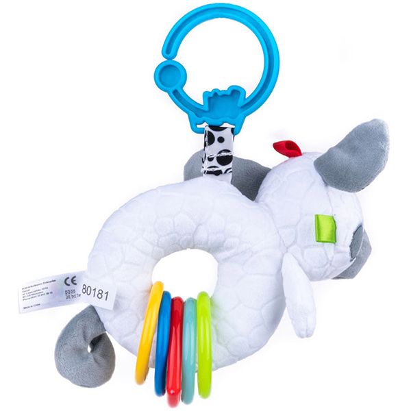 - Главата му е украсена с етикети с различна текстура, а коремът му е украсен с цветни кръгове, които весело дрънчат при разклащане.