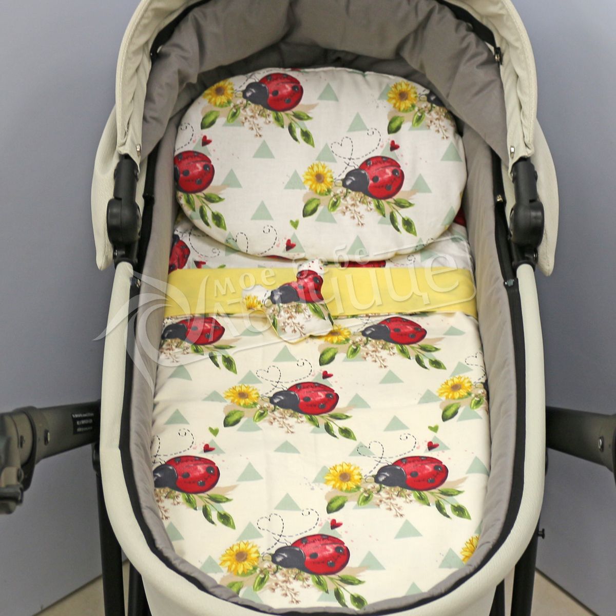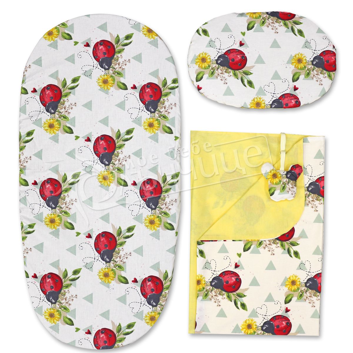 - Комплектът Ladybug се състои от четири части: възглавница, чаршаф с ластик (за матрачето), пелена и сладка играчка, с която Вашето бебе може да си играе.