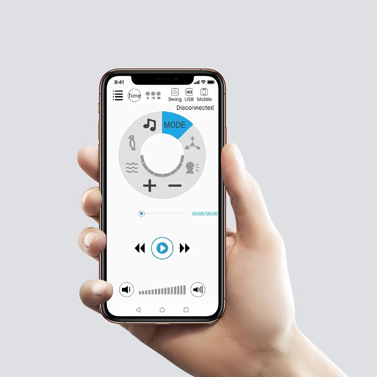 • Предлага удобство и лесна употреба чрез управление с телефонно приложение или контролен панел. Чрез мобилното приложение родителите могат да регулират всички функции на стола, като настройват скорости на люлеене, музикален съпровод и други опции, осигурявайки пълен контрол от разстояние.