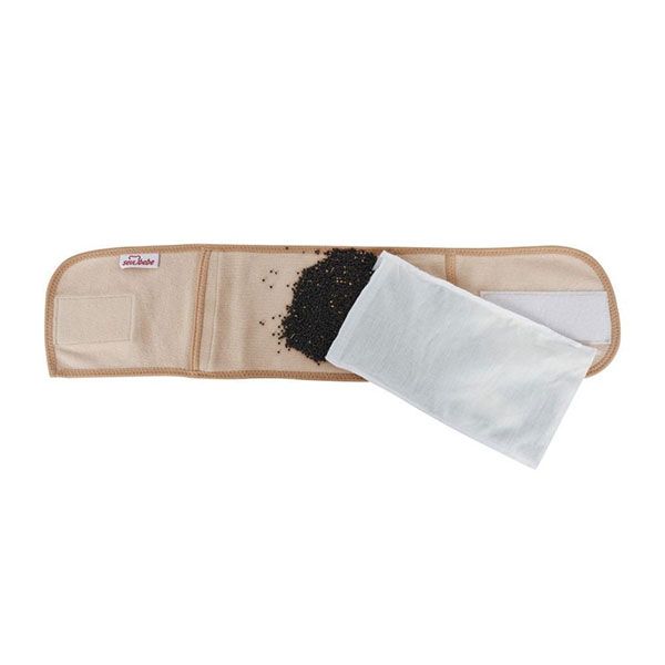 - Торбиката с костилки трябва да се загрее във фурната на 120 градуса за 15 минути.Термичният колан се поставя върху стомаха или крака на бебето.