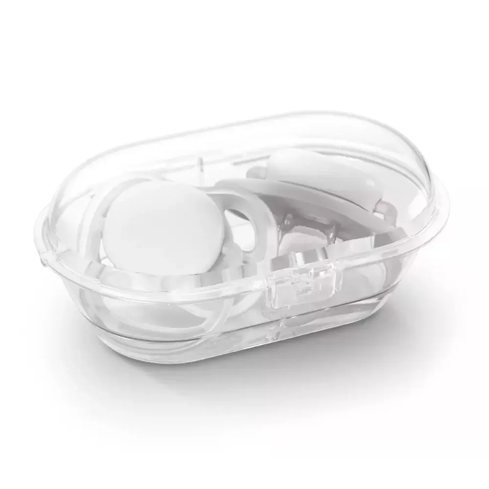 - В комплекта е включена хигиенна кутия на съхранение. Тя е предвидена също и за стерилизиране в микровълнува фурна. Така дори, когато не сте у дома, ще може лесно да се грижите за хигиената на залъгалките.