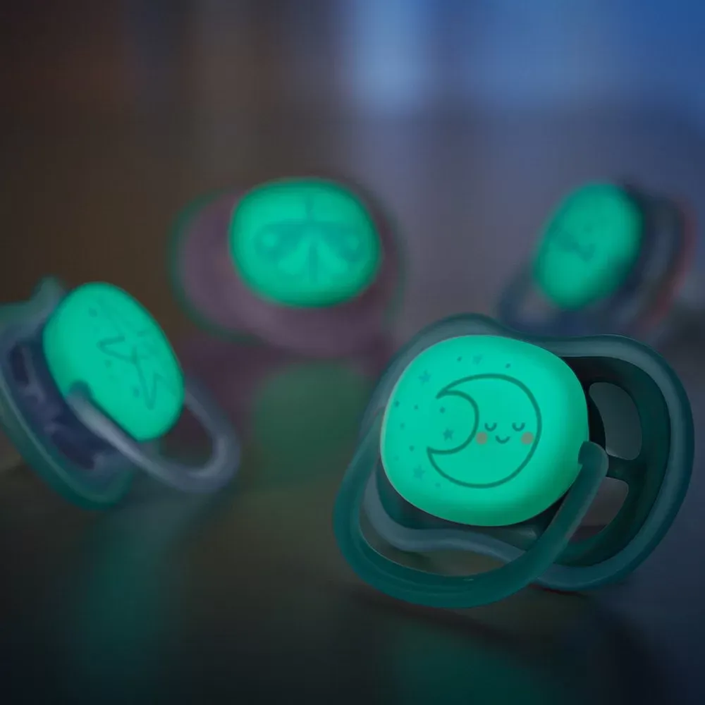 - Благодарение на форсоресциращата си съставка, те светят в тъмното. Това помага на бебето бързо да намери своята залъгалка и през нощта.
