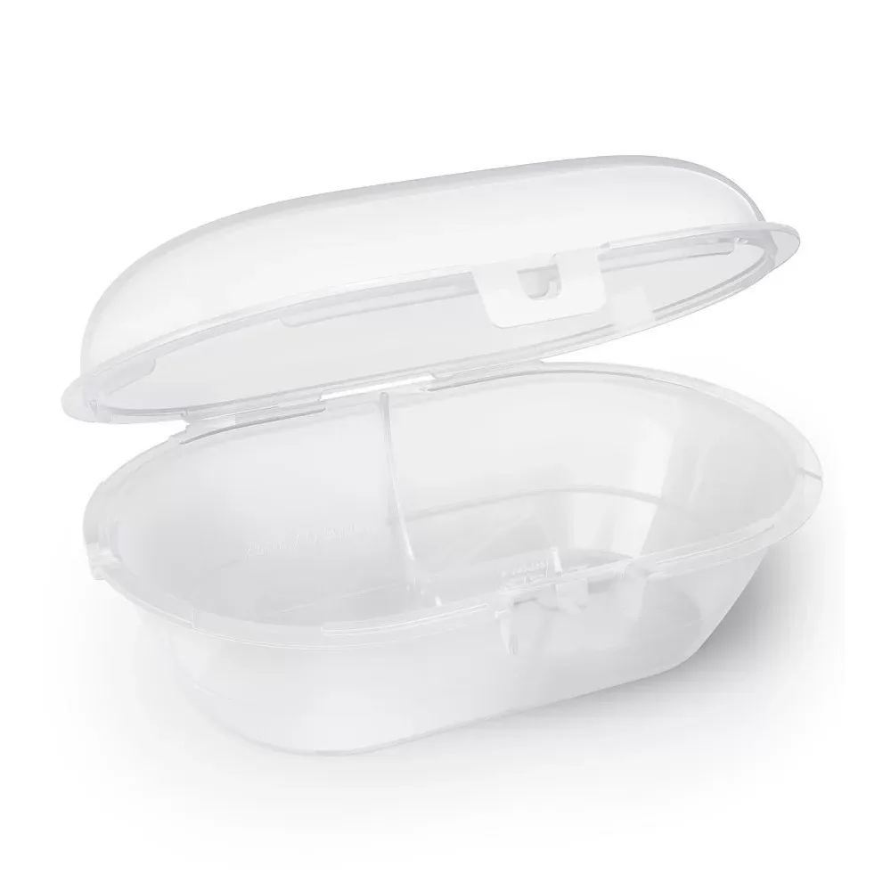 - В комплекта е включена хигиенна кутия на съхранение. Тя е предвидена също и за стерилизиране в микровълнува фурна. Така дори, когато не сте у дома, ще може лесно да се грижите за хигиената на залъгалките.