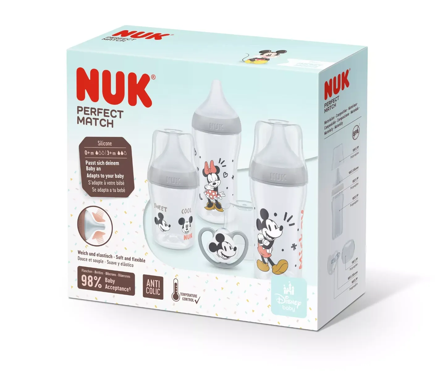 NUK Сет Perfect Match Temperature Control 4 части Mickey е практичен и функционален комплект, създаден специално за новородени и бебета до 6 месеца. Благодарение на уникалната технология за контрол на температурата и специално проектираните силиконови биберони, комплектът гарантира безопасност и комфорт по време на хранене. Продуктите са декорирани с образа на обичания герой Mickey Mouse, който ще донесе радост на малкото дете.