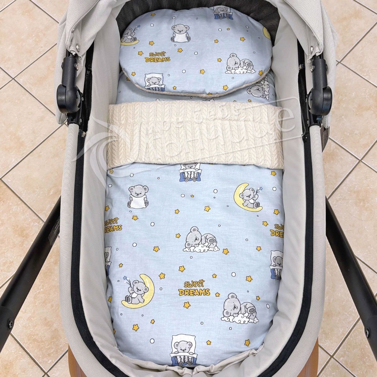 - Чаршафчето е снабдено с ластик за лесно и стабилно фиксиране към матрачето на количката.