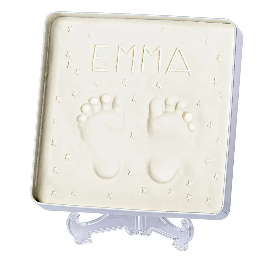 - Очарователна кръгла кутия за отпечатък, която е създадена да съхрани най-скъпите моменти от бебешките дни.