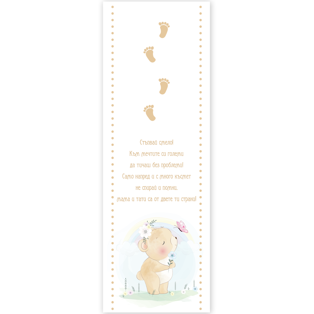 - Дизайнът включва нежни цветови комбинации, закачлива илюстрация на меченце и специално послание.