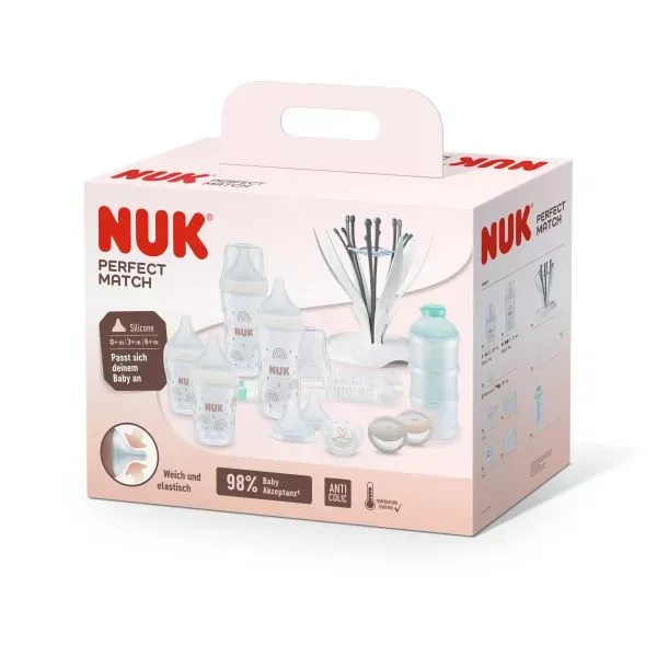 NUK Perfect Match PP Сет Premium 11 части – Дъга е практичен и пълен комплект, който предлага всичко необходимо за грижата за новороденото бебе – от хранене и успокояване, до почистване и съхранение. Създаден с мисъл за комфорта на бебето и удобството на родителите.