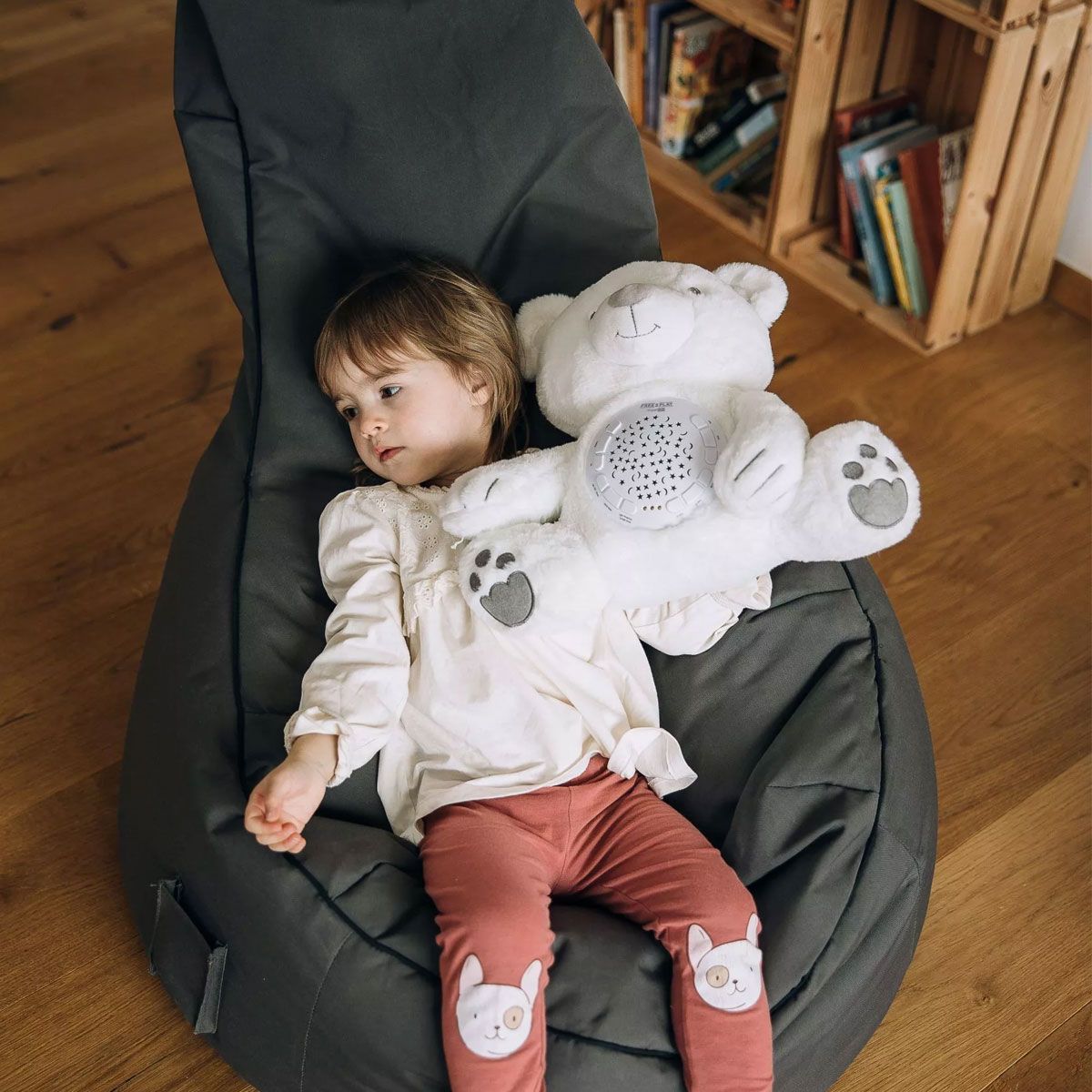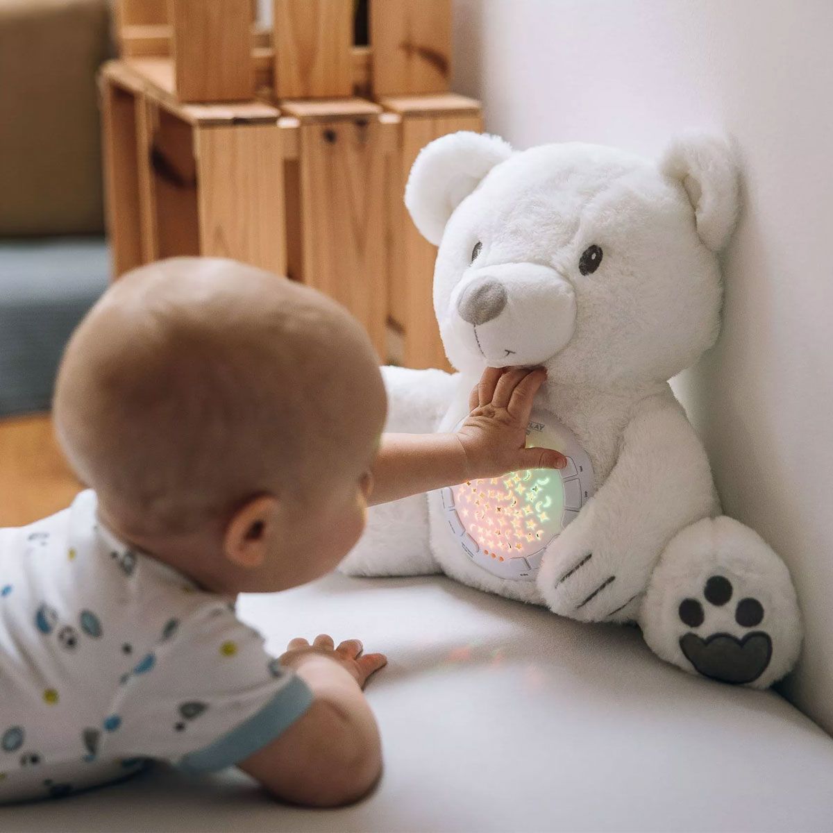 - Меко и пухкаво плюшено мече, създадено да успокоява бебето преди сън.