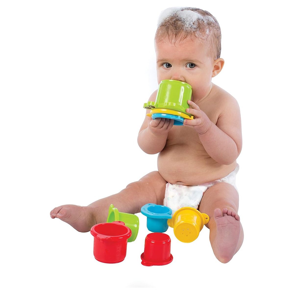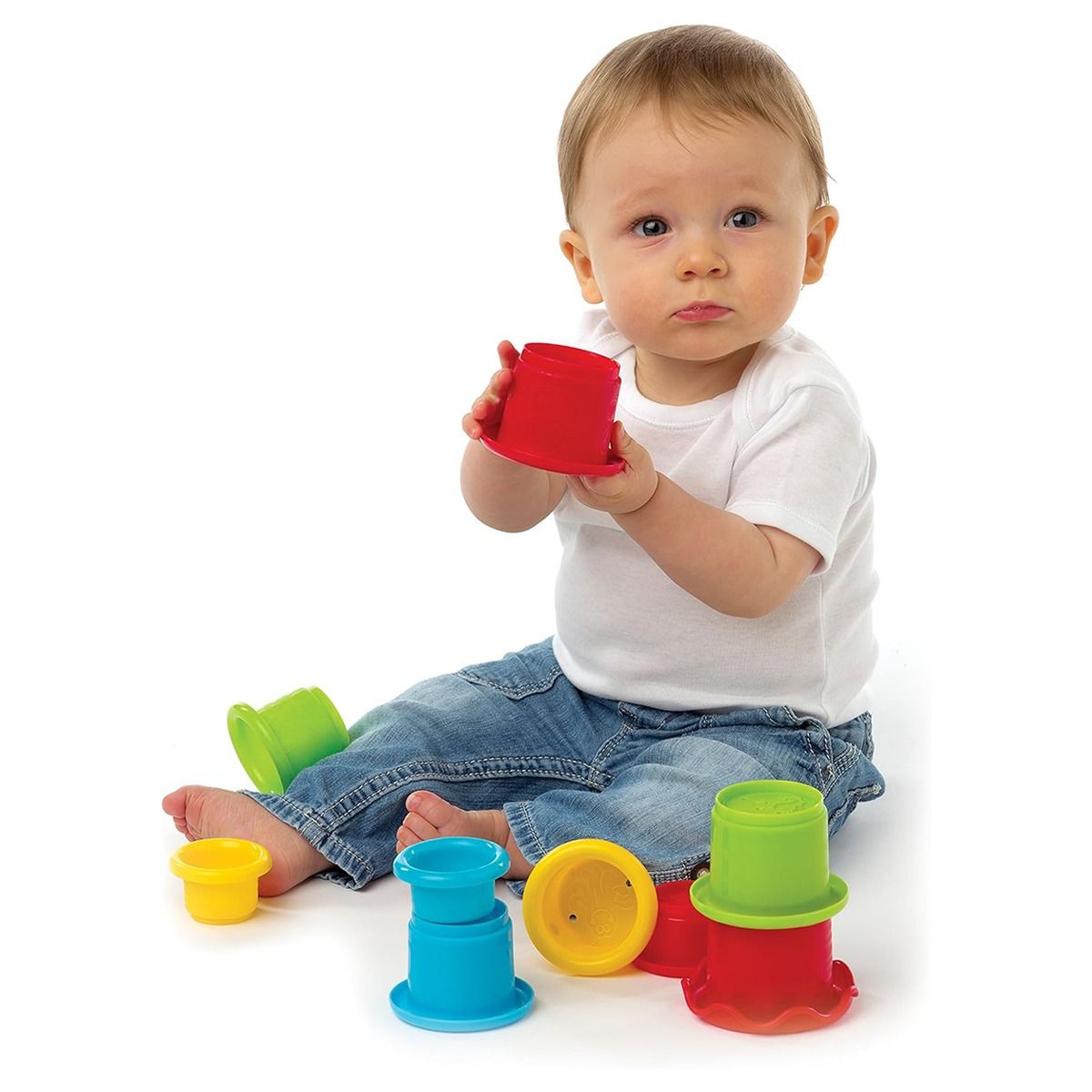 - Комплект от 9 цветни чашки Playgro Stacking Fun Cups за подреждане, игра с вода и пясък.
