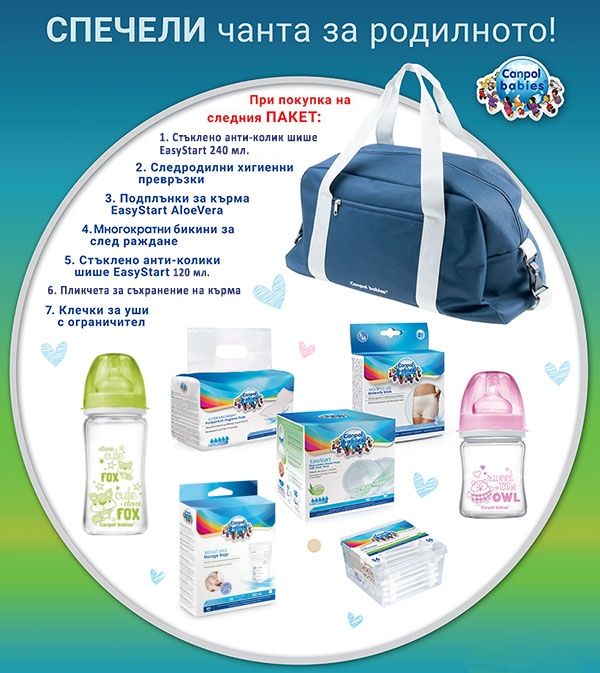 - Вземете комплекта от седем продукта на марката Canpol и си спечелете фантастичен подарък - чанта за родилното отделение.