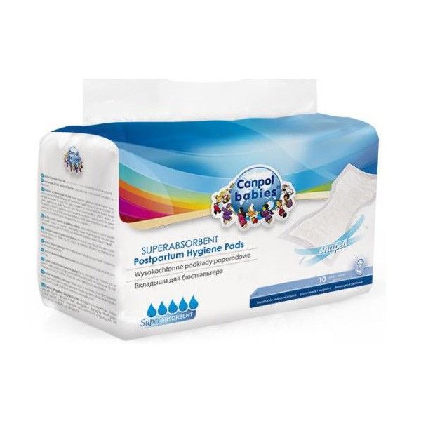 - Следродилни хигиенни превръзки CANPOL - Превръзките предназначени за родилки са предпочитани пред останалите по няколко причини: Имат широка форма и фина структура, които осигуряват дискретност и ефективна защита от замърсяване. Благодарение на желиращото си свойство бързо абсорбират и задържат влагата вътре и така се неутрализира миризмата. Имат самозалепваща лента, която ги фиксира, пакетът съдържа 10бр. с размери 35/19 см