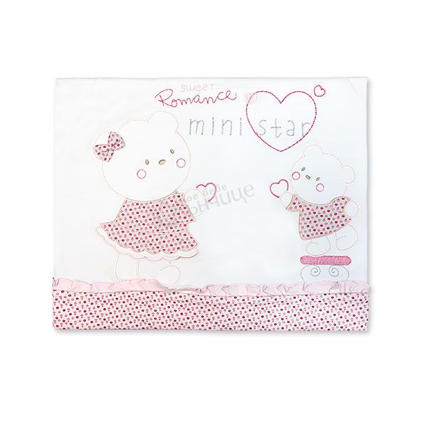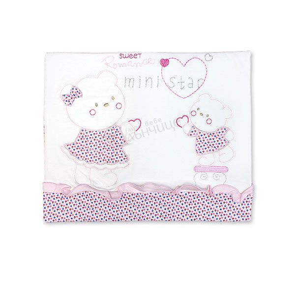 - Предлага се в бял цвят с детайли в детайли в розов или прасковен цвят. В допълнение са добавени чаровни къдрички и сладки мечета.